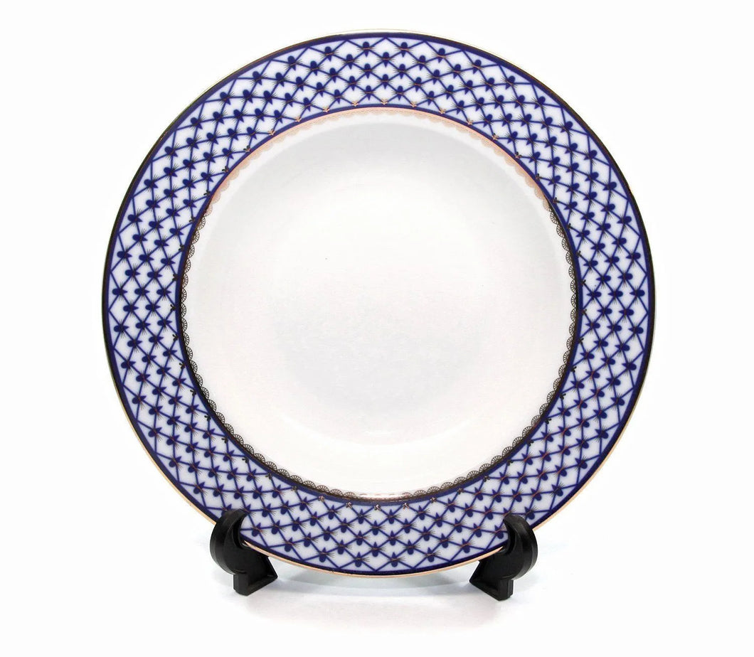 Famous Lomonosov inspired Russian blue cobalt net design (reproduction). Made of high quality Bone China porcelain. Set of 6 large soup bowls, measuring approx. 9" in diameter. Beautiful hand painted design enriched with 24 Karat gold accents under glaze. Recommended hand wash.