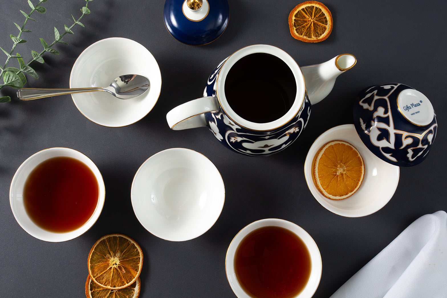 The cotton pattern design tea pialas bring a cultural touch to every occasion, with a rich blue base accented by elegant white and gold patterns. This stunning combination makes the set a centerpiece for any table, whether for everyday use or special gatherings.
