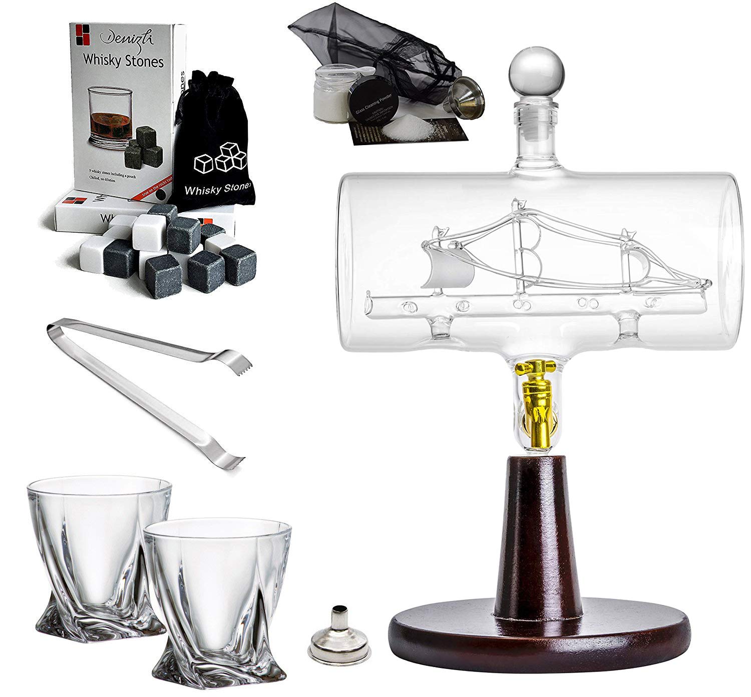 - Set Includes: Decanter, 2 X Diamond Glasses, Tongs, Whisky Stones, Cleaning Kit, Funnel